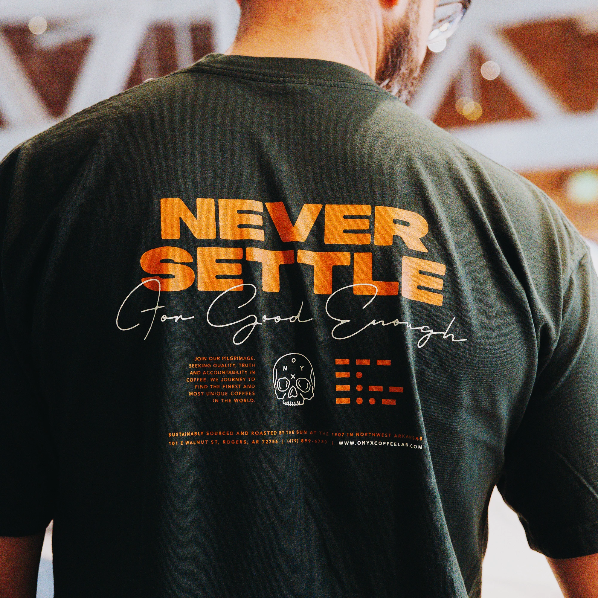 Are you feeling bold? Are you making moves? Well do we have the shirt for you! This type based design features “ONYX” in international morse code along with our call to action alongside our tried & true motto, “never settle for good enough”.