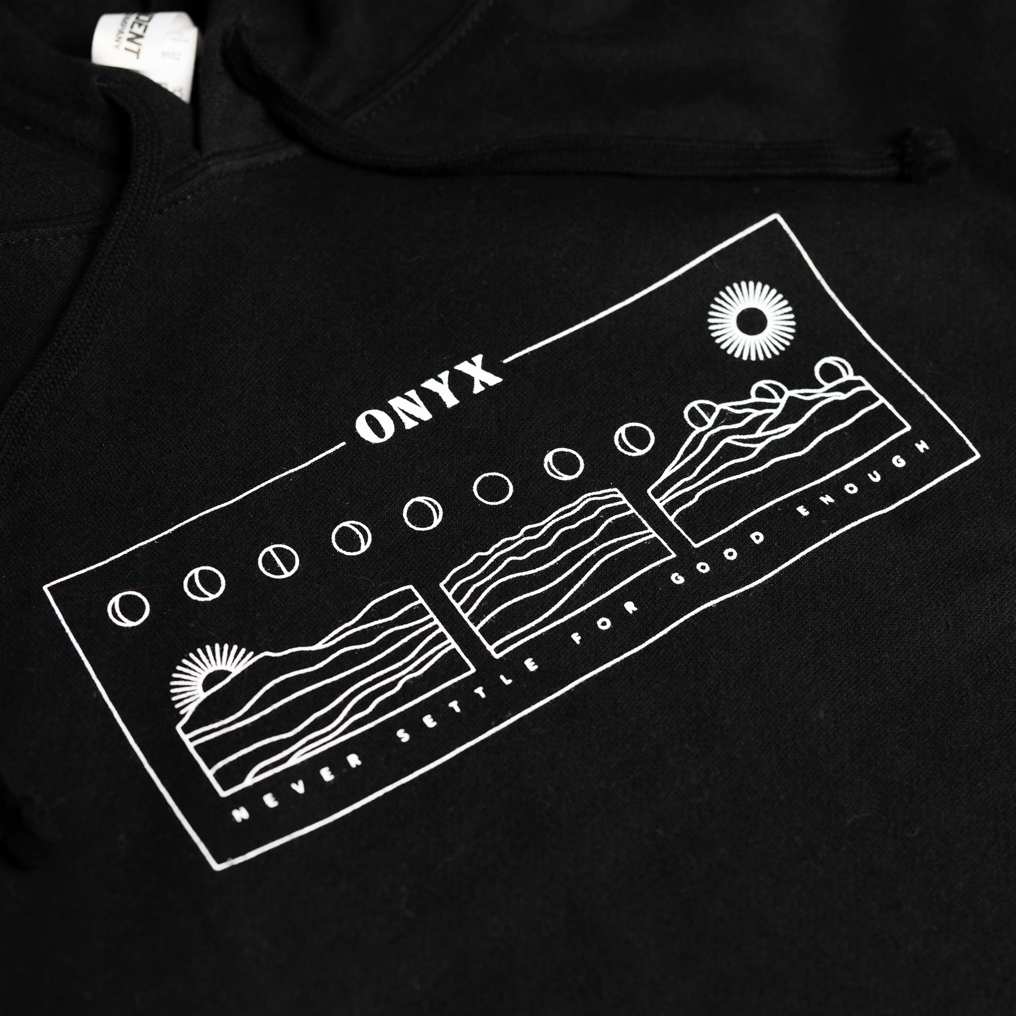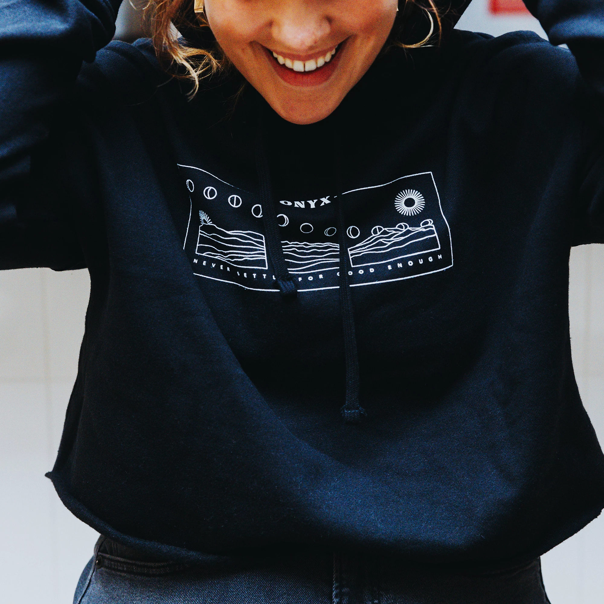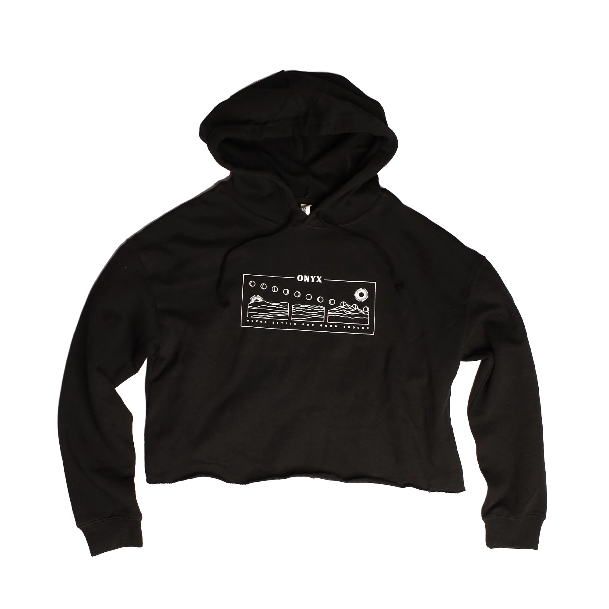This custom printed cropped hoodie features a screen printed chest design and a raw bottom hem.