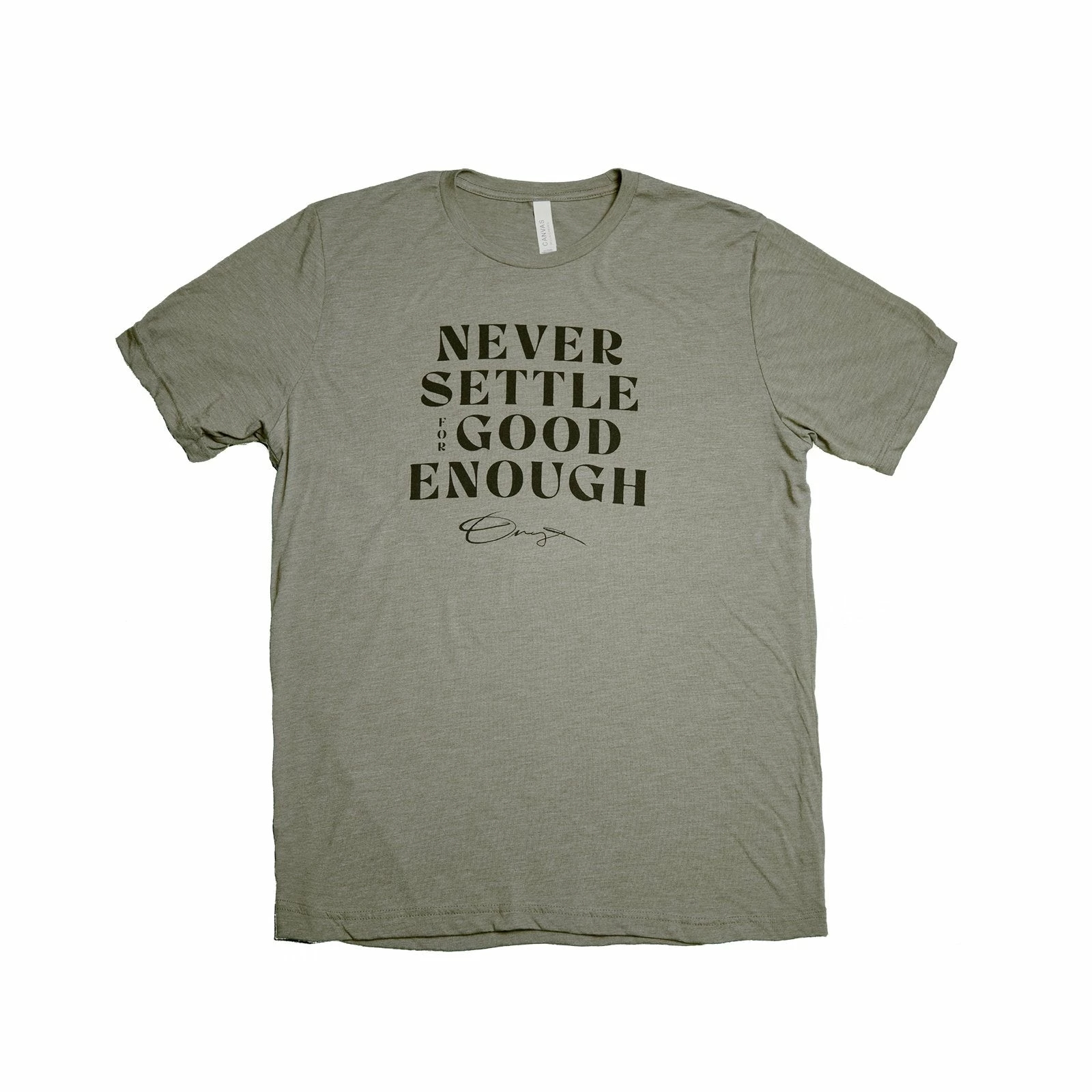 Olive green large print of our mission statement. “Never Settle for Good Enough” is what we built our company on. Soft clean tee shirt with a hard strict message. Helps remind you to continue forward and never settle.