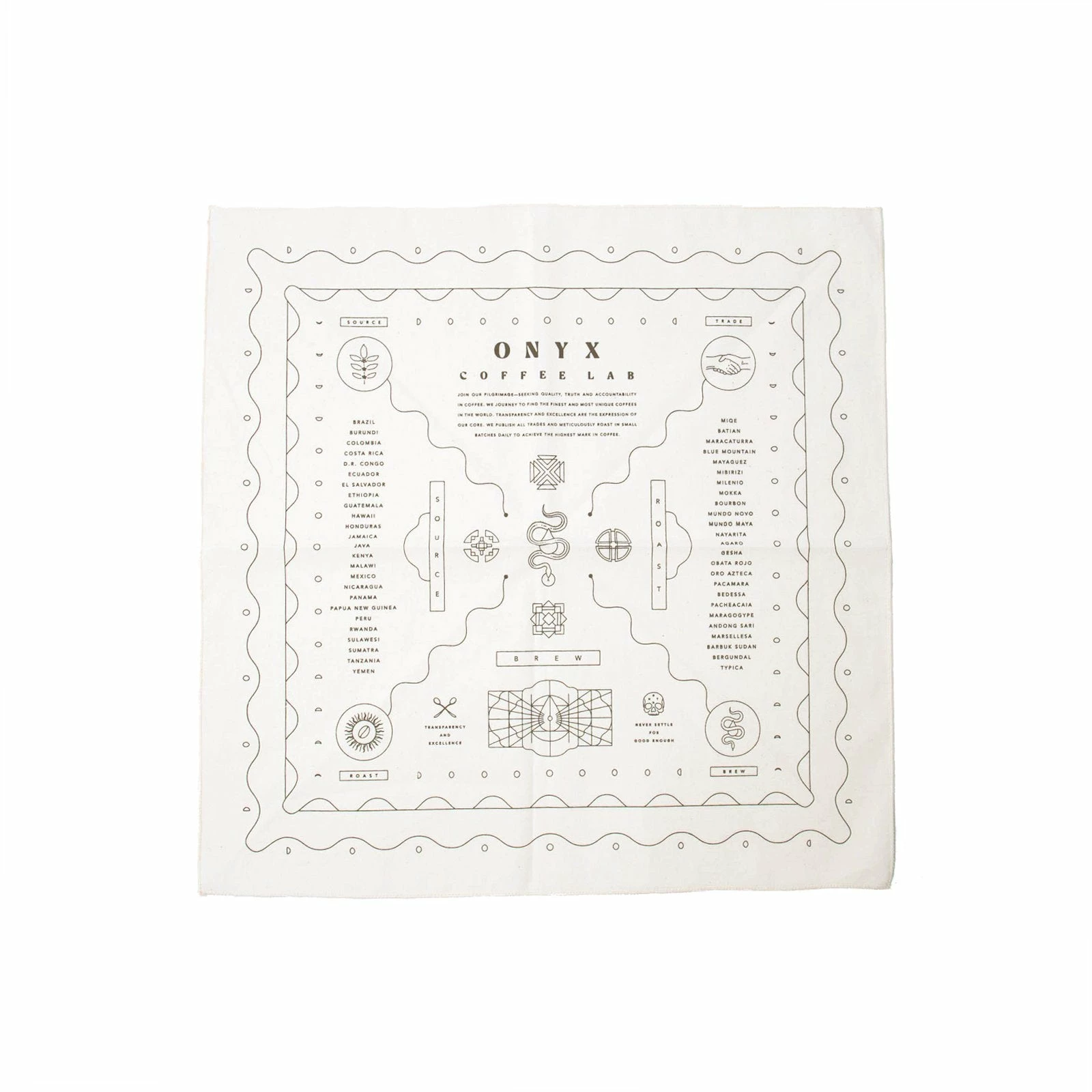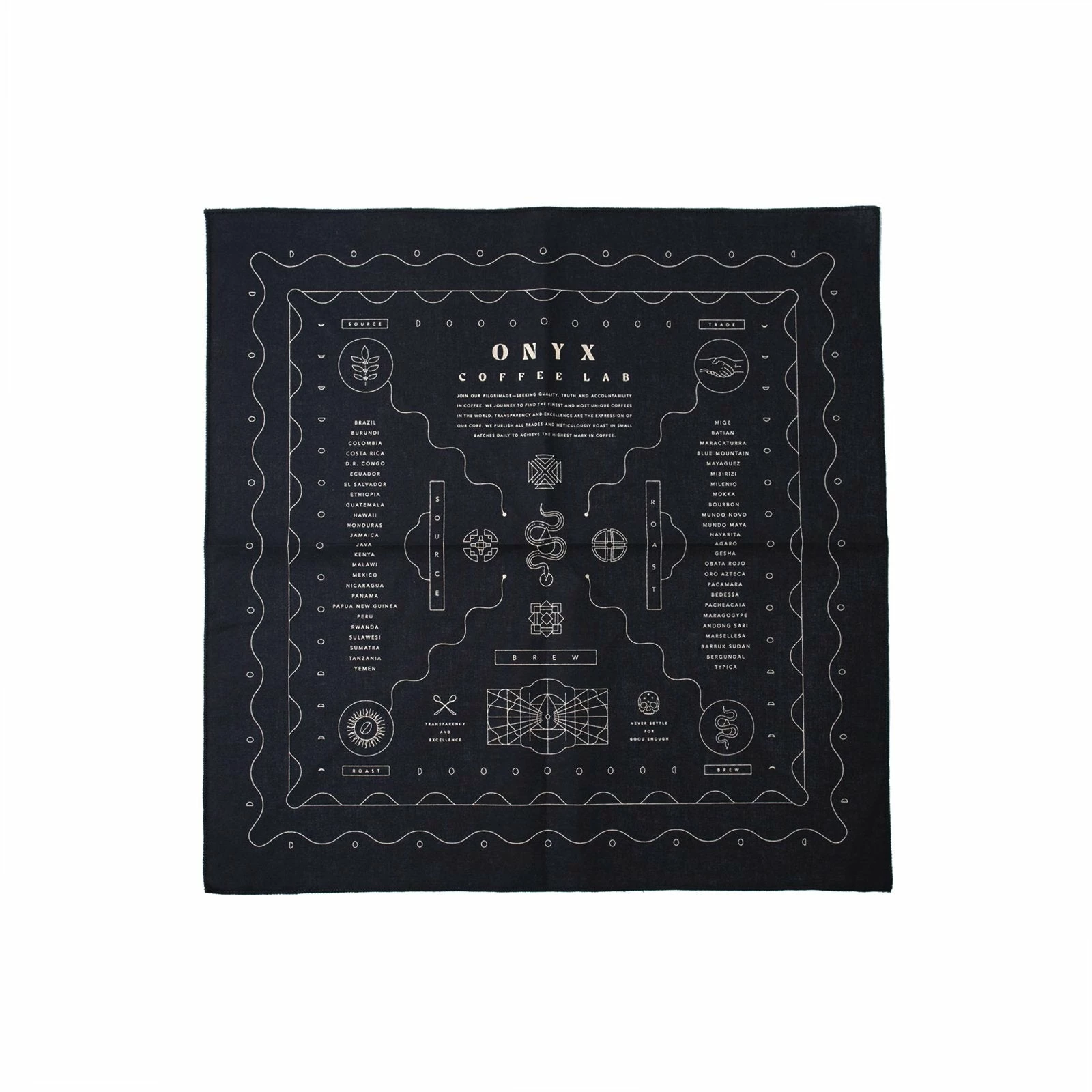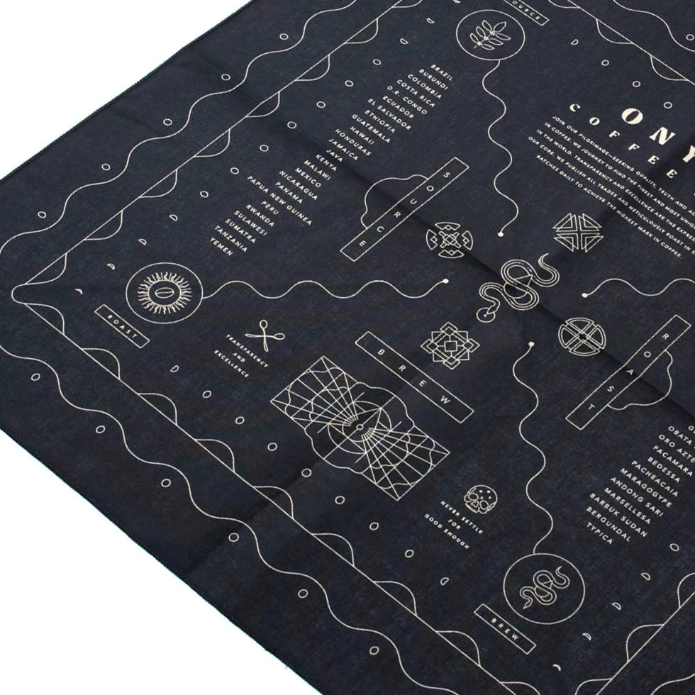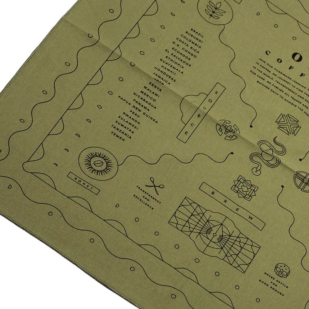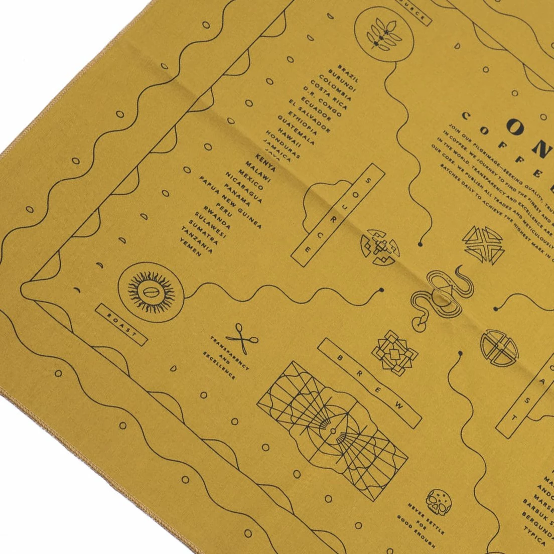 This conspectus bandana contrasts black cotton with peach print. One sided print telling of our never ending journey to find the perfect coffee. Can be worn as an accessory or utilized as a handkerchief. Â