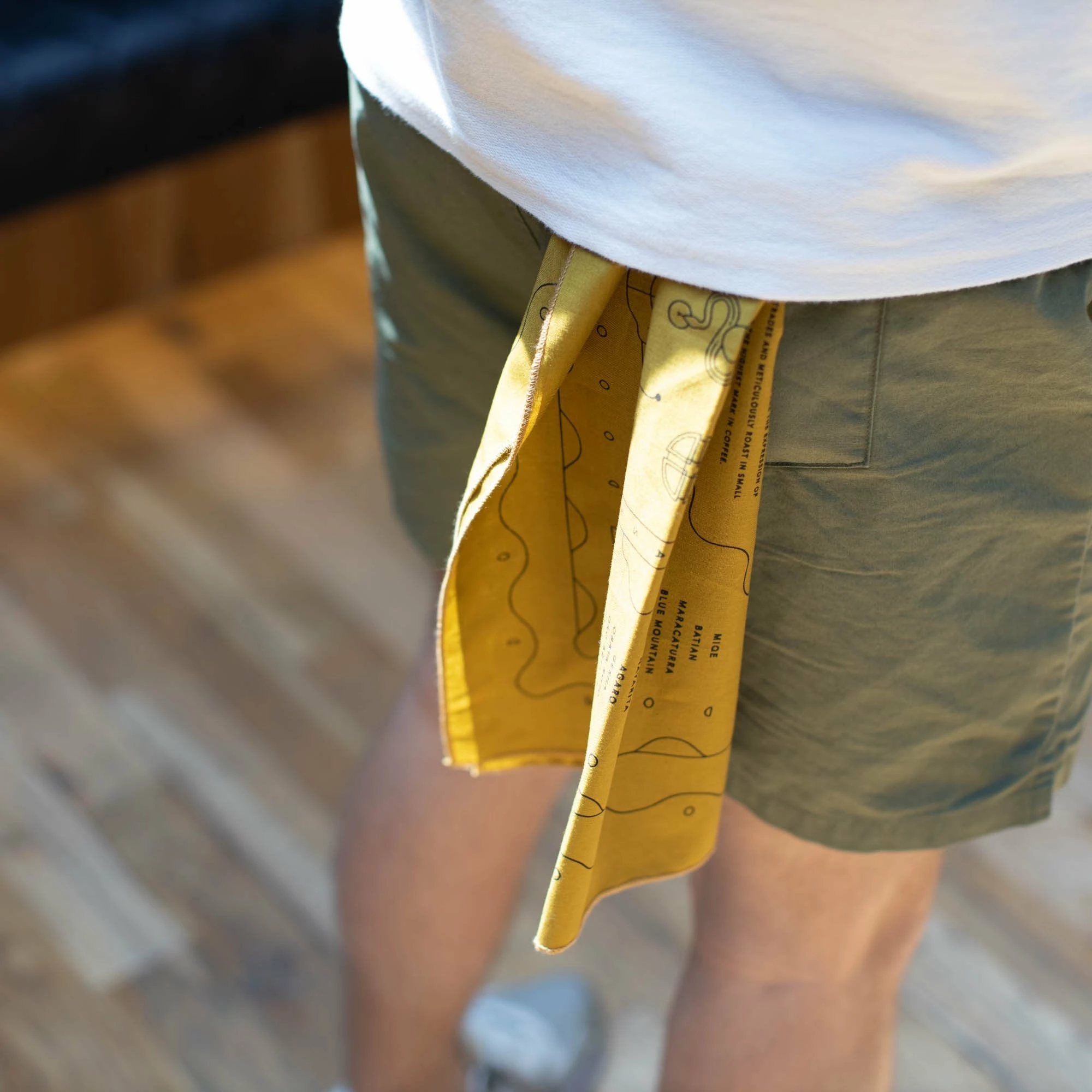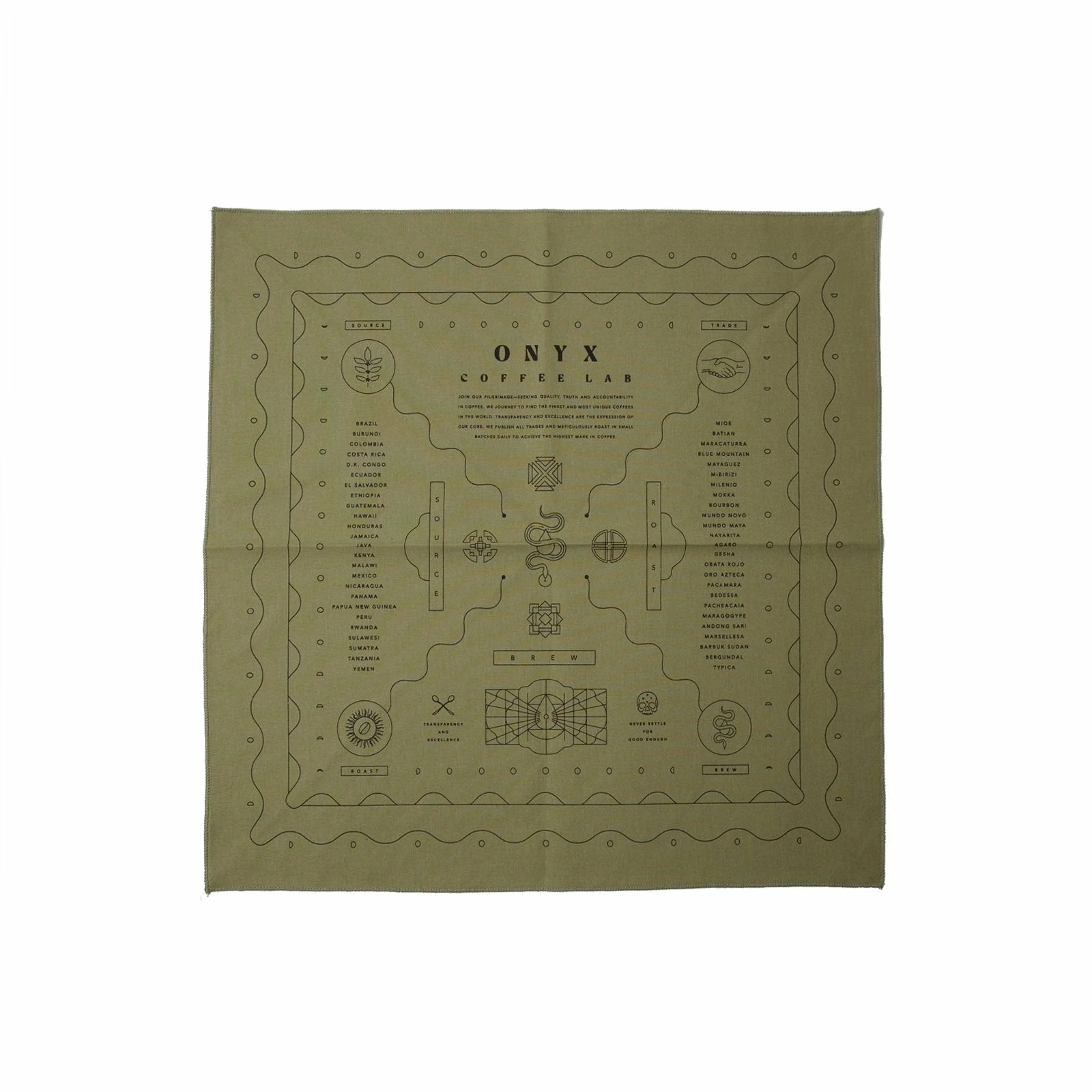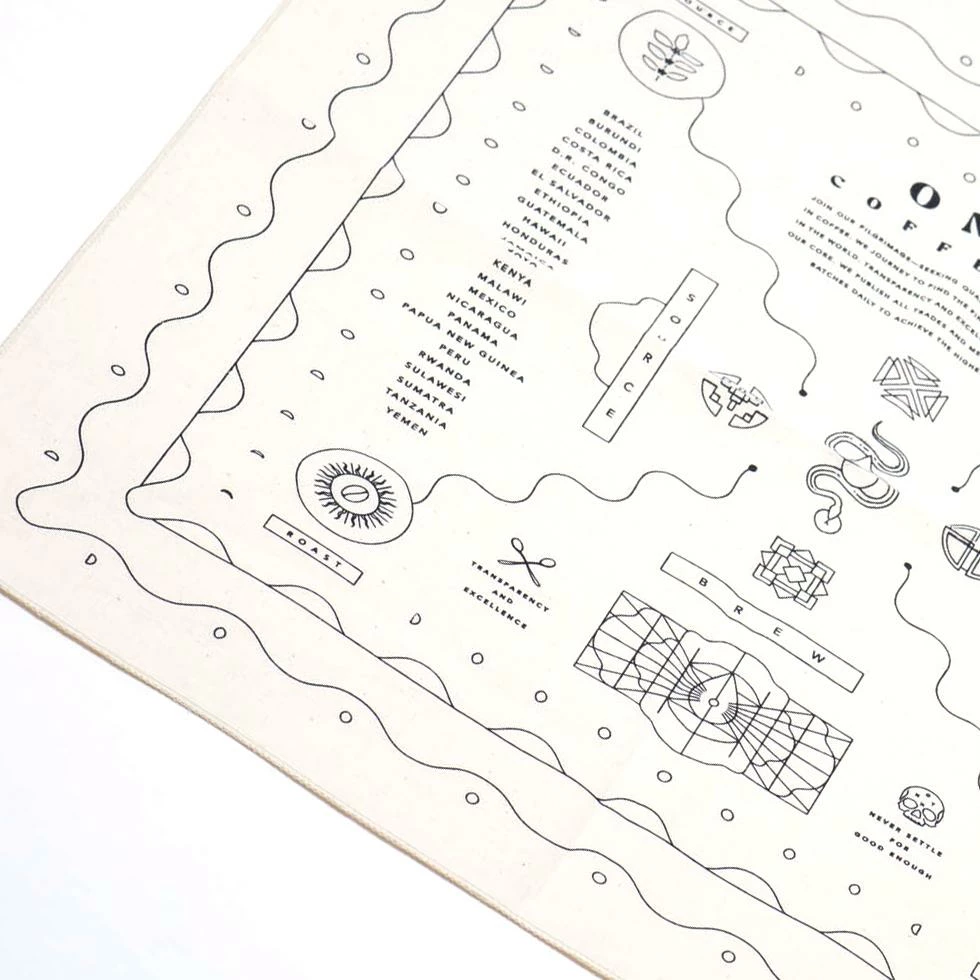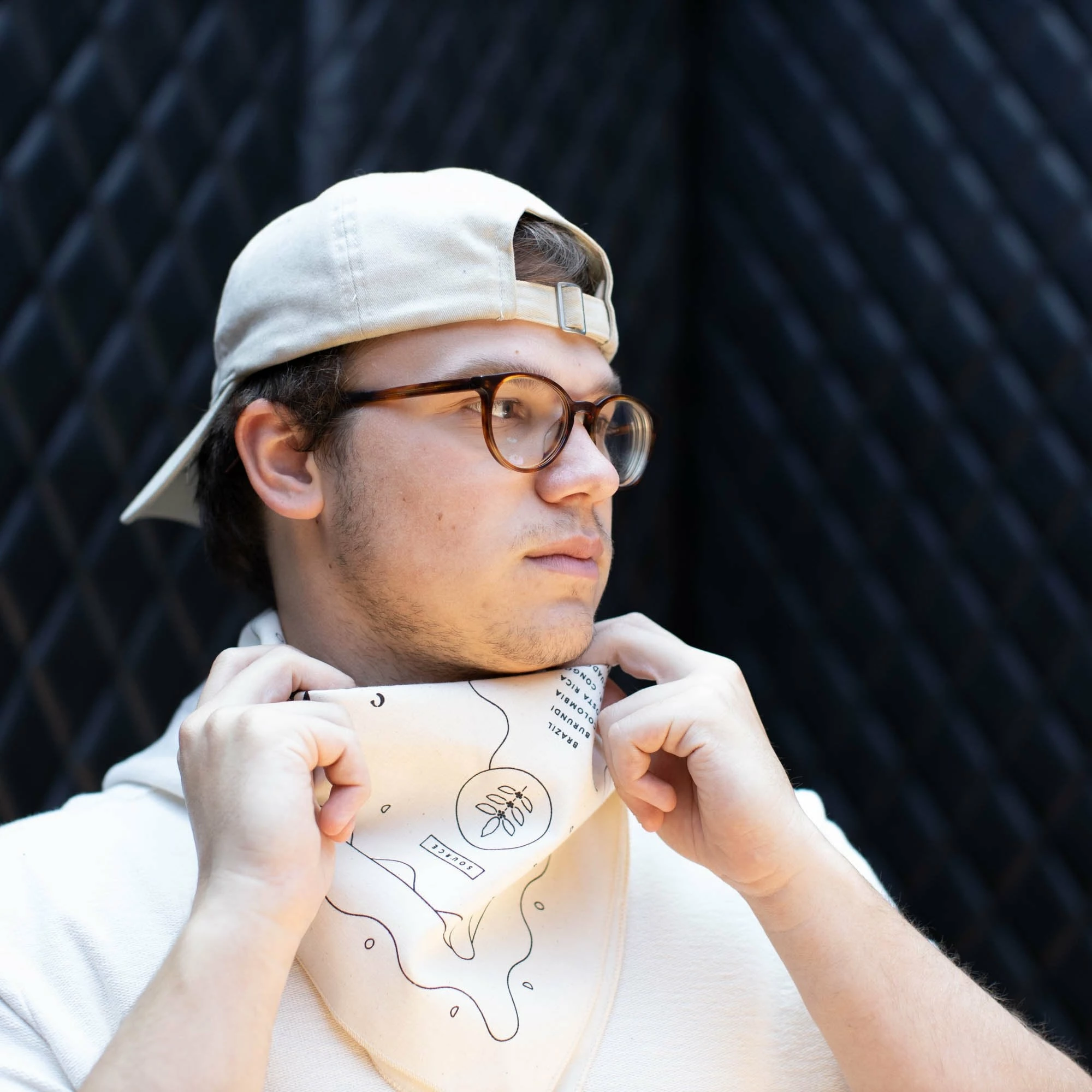 This conspectus bandana contrasts black cotton with peach print. One sided print telling of our never ending journey to find the perfect coffee. Can be worn as an accessory or utilized as a handkerchief. Â