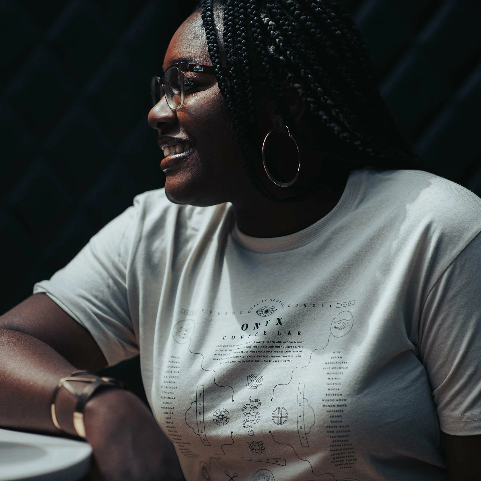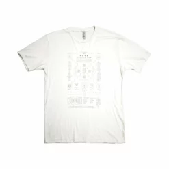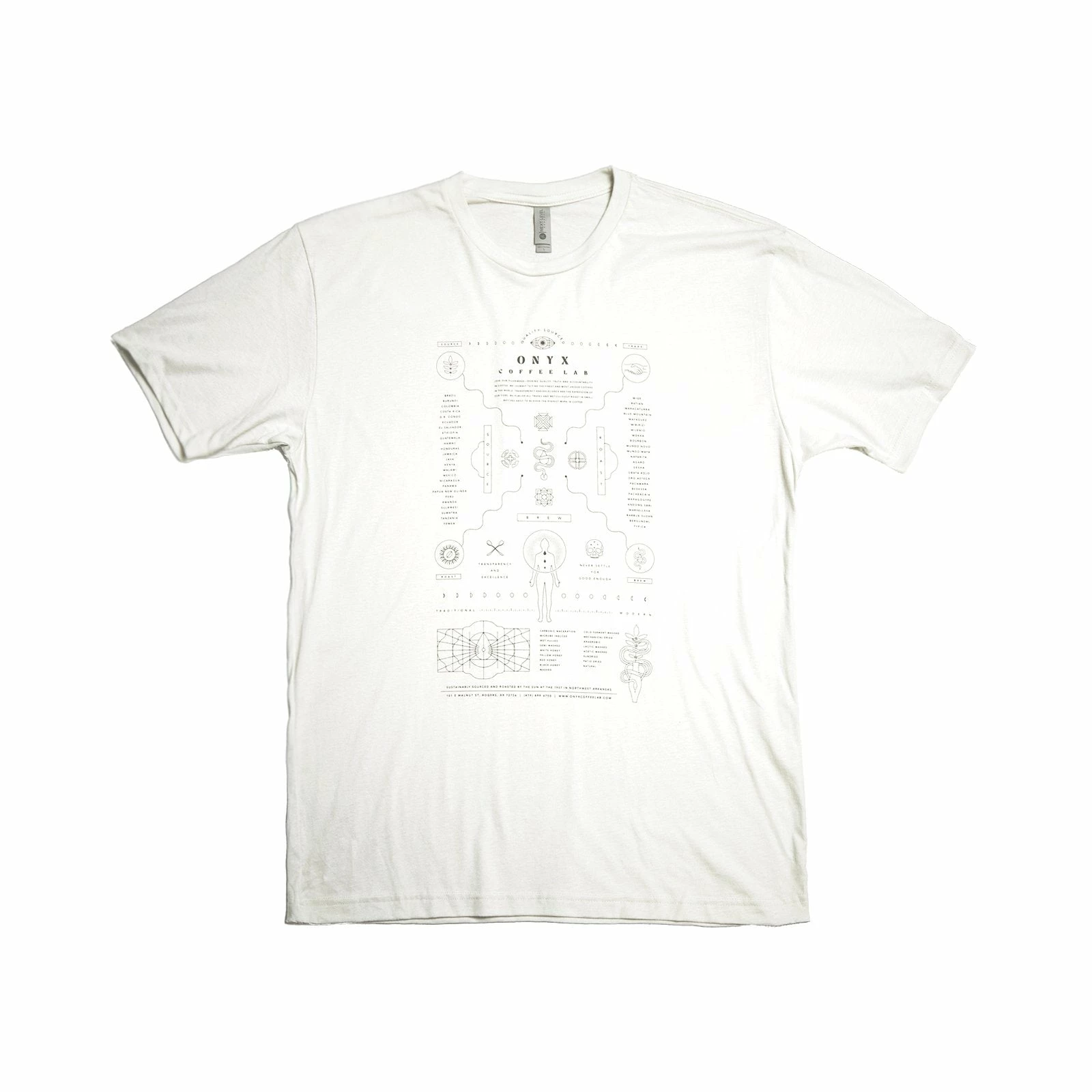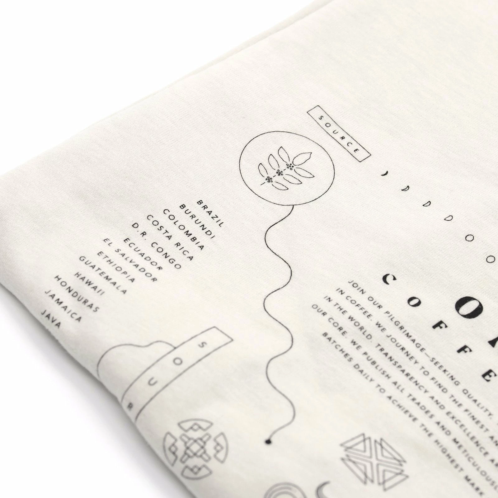 This conspectus tee shirt contrasts natural white cotton with black print. Oversized front print telling of our never ending journey to find the perfect coffee. Small skull and bywords printed on the upper back. This shirt is geared toward the coffee professional but we wouldn’t recommend wearing this on shift.